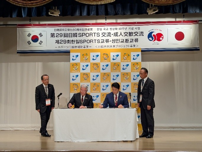 また、交流最終日の前日となる9月23日に行われた歓送夕食会の開催前には、愛媛県スポーツ協会と全羅南道体育会との間で、「スポーツによる交流協定書」の調印式が行われ、韓国選手団団長の全羅南道体育会・宋珍虎会長と愛媛県スポーツ協会・大塚岩男会長が協定書に署名し、今後定期的な交流を行うことで合意しました。