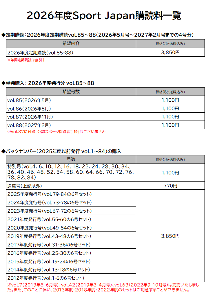 ※日本スポーツ協会公認スポーツ指導者(サッカー競技、バスケットボール競技、スポーツリーダーを除く)とスポーツ少年団の登録料には本誌購読料が含まれておりますので、本ページからお申し込みいただく必要はございません。なお、公認スポーツ指導者宛に1部、スポーツ少年団事務担当者宛に2部送付しておりますが、ご指定の場所に届かない場合は下記連絡先までお知らせください。