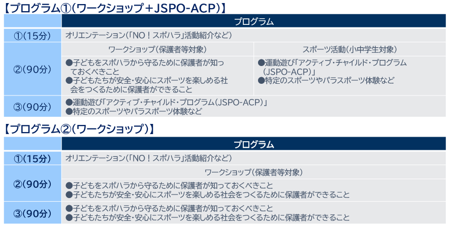 【国庫補助事業】 スポーツ・ハラスメント防止・啓発セミナー 小中学生の保護者・指導者等を対象として、「スポーツ・ハラスメント防止・啓発セミナー」としてワークショップを実施します。 また、一部の開催回では、JSPOが取り組んでいる事業「アクティブ・チャイルド・プログラム(JSPO-ACP)」を並行開催し、子どももご参加いただけるイベントとして実施します。