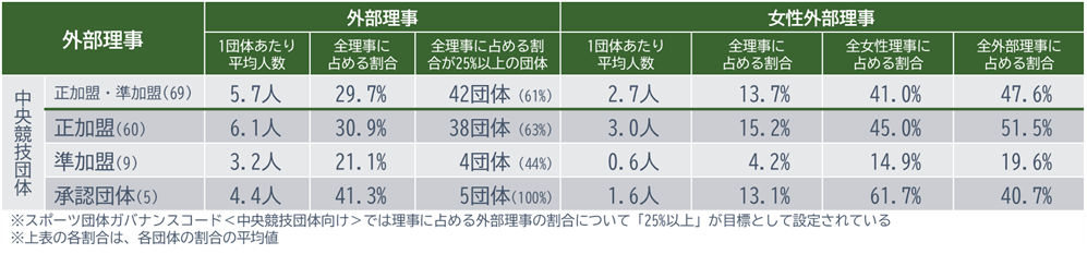 また、今回から項目を追加した外部理事については、中央競技団体(正加盟60/準加盟9団体)では、61%にあたる42団体で、ガバナンスコードにおける外部理事の割合25%以上の基準を満たされました。さらに、全女性理事に占める女性外部理事の割合は41.0%、全外部理事に占める女性外部理事の割合は47.6%となっており、女性理事の登用において外部人材の活用が重要な役割を果たしている実態が確認されました。