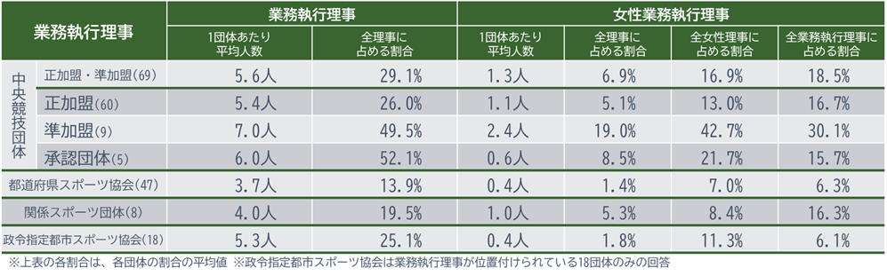 ※本資料における割合は、一部を除いて、該当団体の人数等の総数における割合(例:女性理事の総数を理事の総数で割った割合)ではなく、各団体における割合(例:該当団体の女性理事の人数を理事の人数で割った割合)の平均値を示したものです。これは団体ごとの取り組み状況を公平に把握するためであり、理事数の多い団体の影響を過度に受けないようにするためです。
