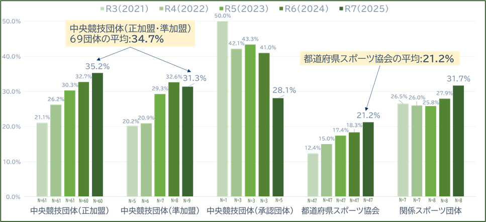 ●中央競技団体の平均(正加盟・準加盟69団体) : 34.7% (前年:32.7%) → 2.0ポイント増加